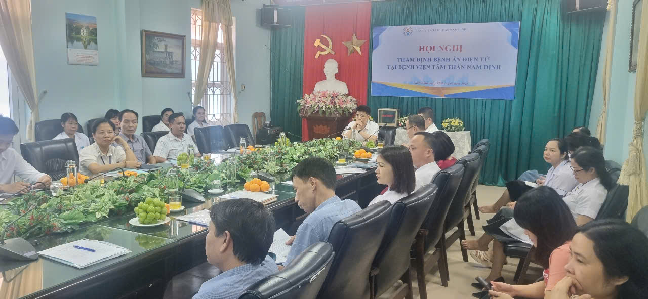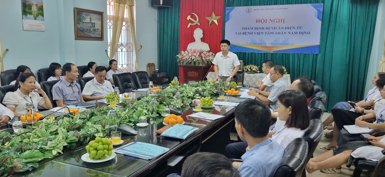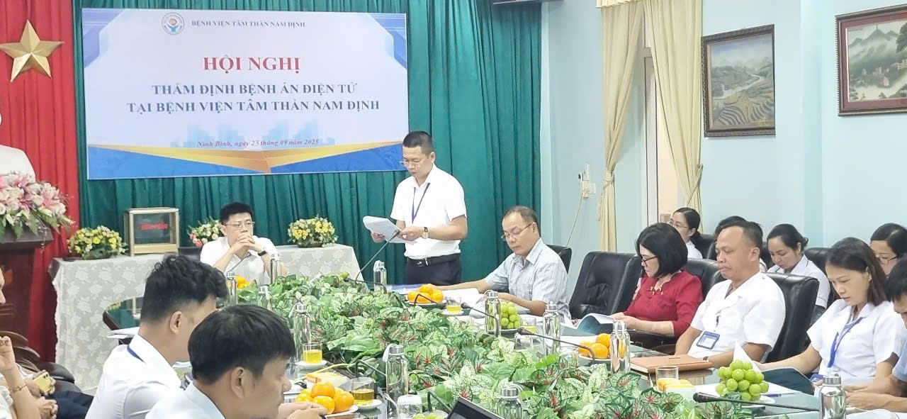 Chiều ngày 25/9/2025, Bệnh viện Tâm thần Nam Định tổ chức Hội nghị thẩm định hồ sơ bệnh án điện tử. Về dự và chủ trì Hội nghị có đồng chí Phan Anh Phong – Phó Giám đốc Sở Y tế tỉnh Ninh Bình – Chủ tịch Hội đồng chuyên môn thẩm định bệnh án điện tử, ông Phạm Duy Kiều – Quyền Giám đốc Bệnh viện Tâm thần Nam Định – Phó Chủ tịch Hội đồng, đại diện một số phòng chức năng của Sở Y tế, đại diện BHXH tỉnh, các chuyên viên công ty phần mềm VNPT, …. cùng các thành viên hội đồng thẩm định.