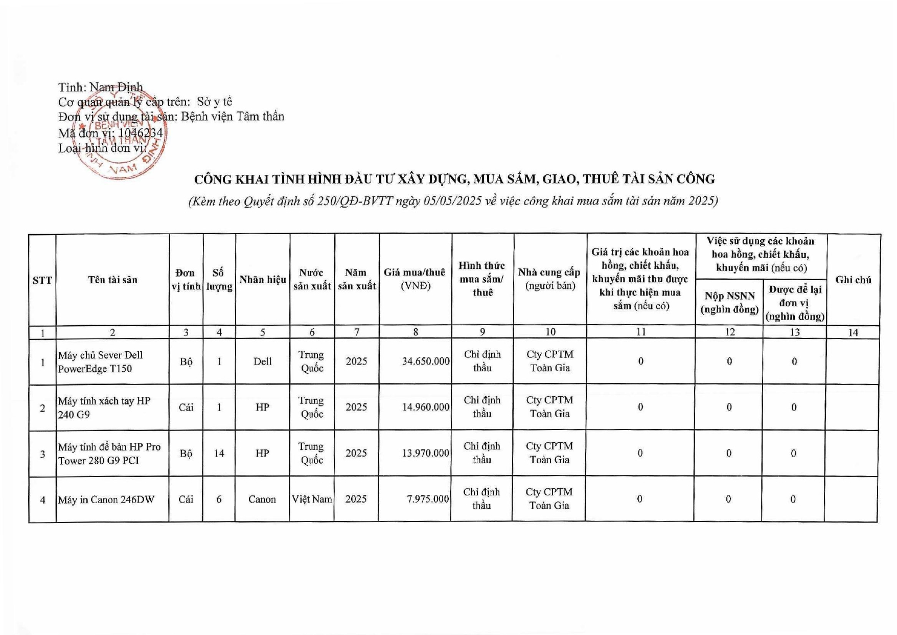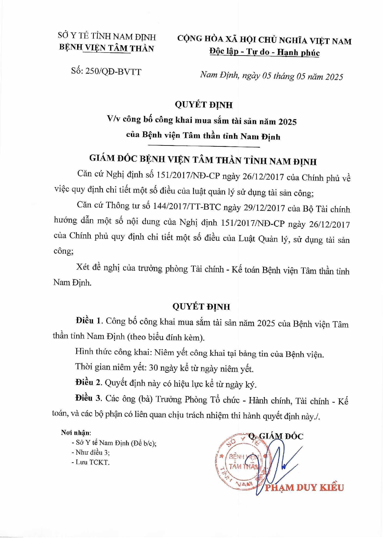 Quyết định công khai mua sắm tài sản năm 2025 của bệnh viện Tâm thần Nam Định