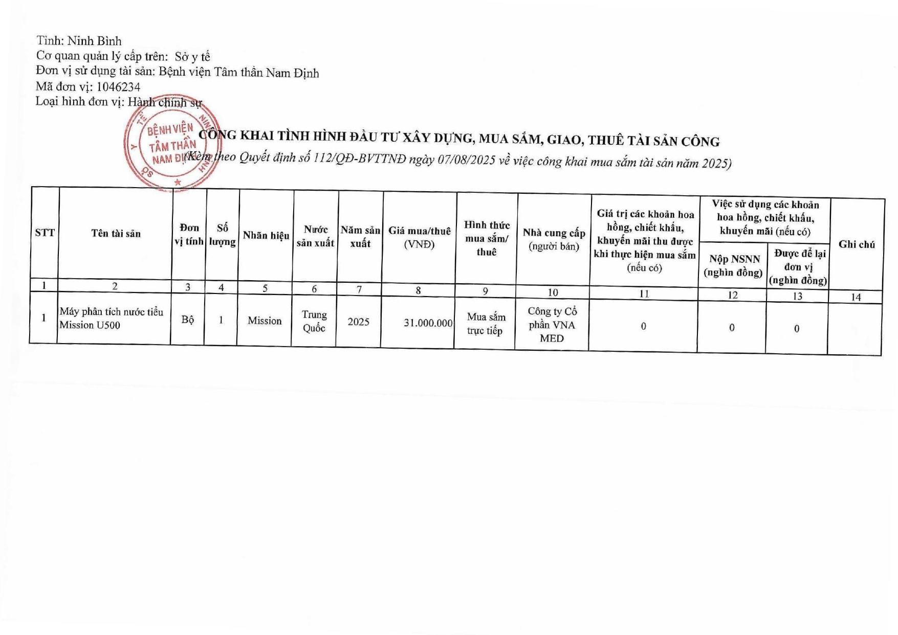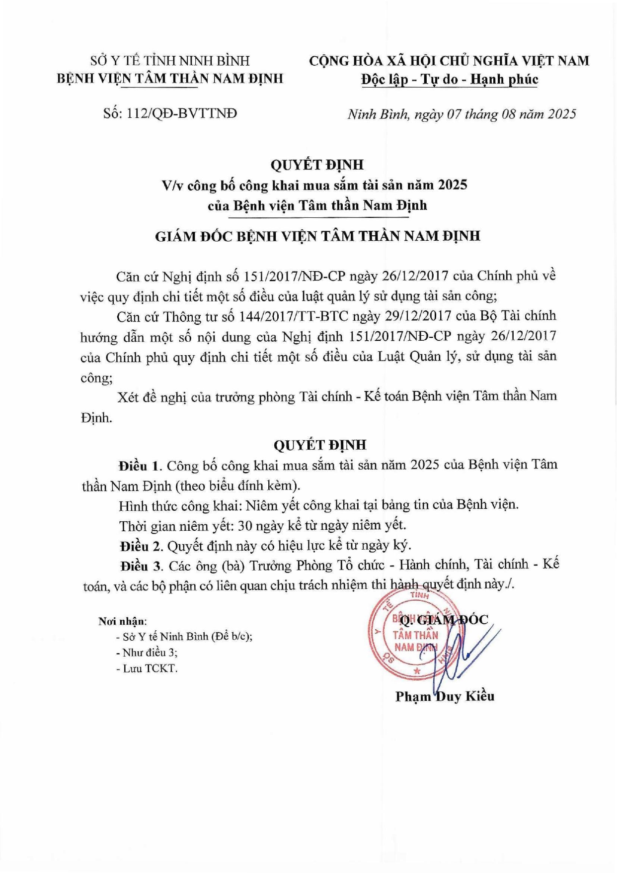Quyết định công khai mua sắm tài sản năm 2025 của bệnh viện Tâm thần Nam Định