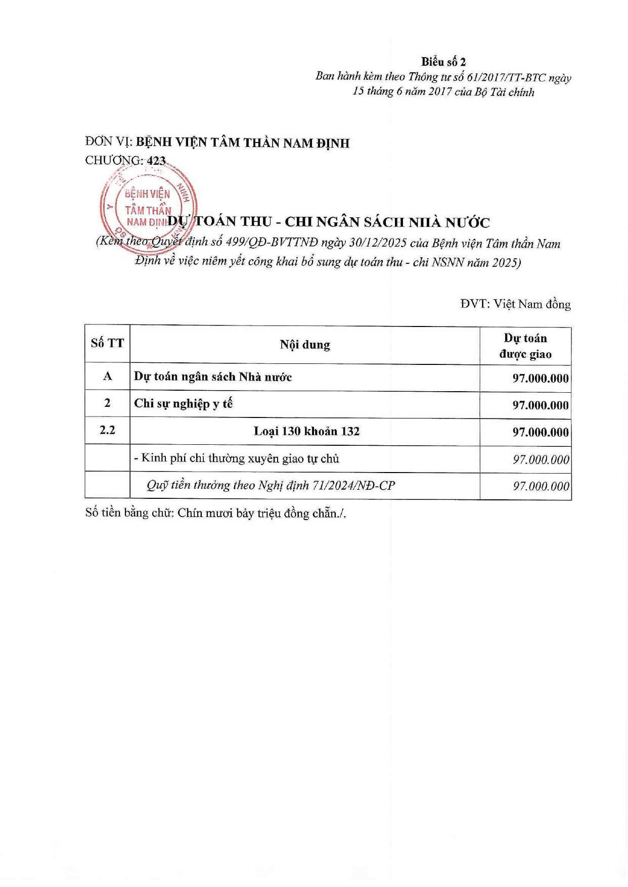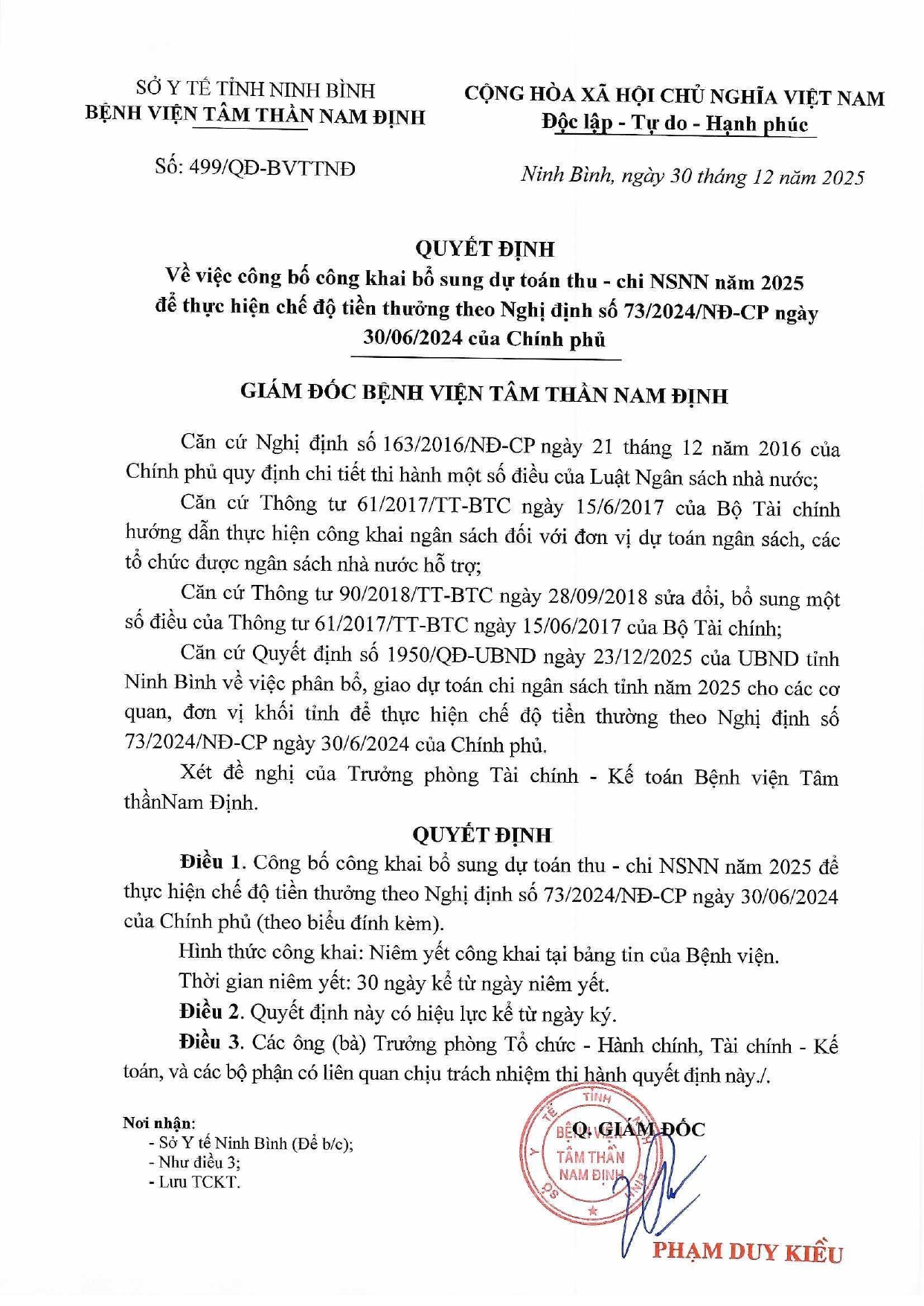 Quyết định về việc công bố công khai bổ sung dự toán thu chi NSNN năm 2025 theo nghị định 73/2024/NĐ-CP của bệnh viện Tâm thần Nam Định