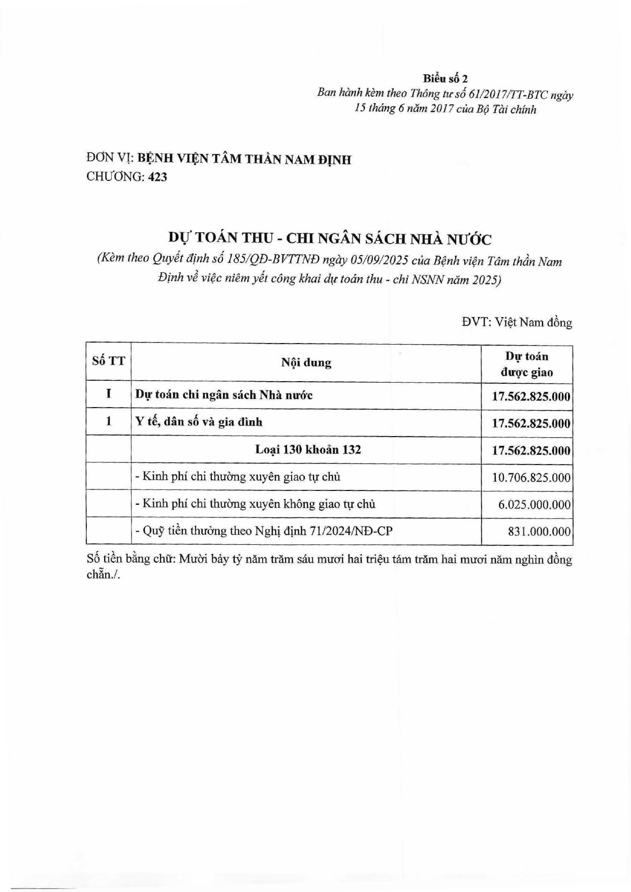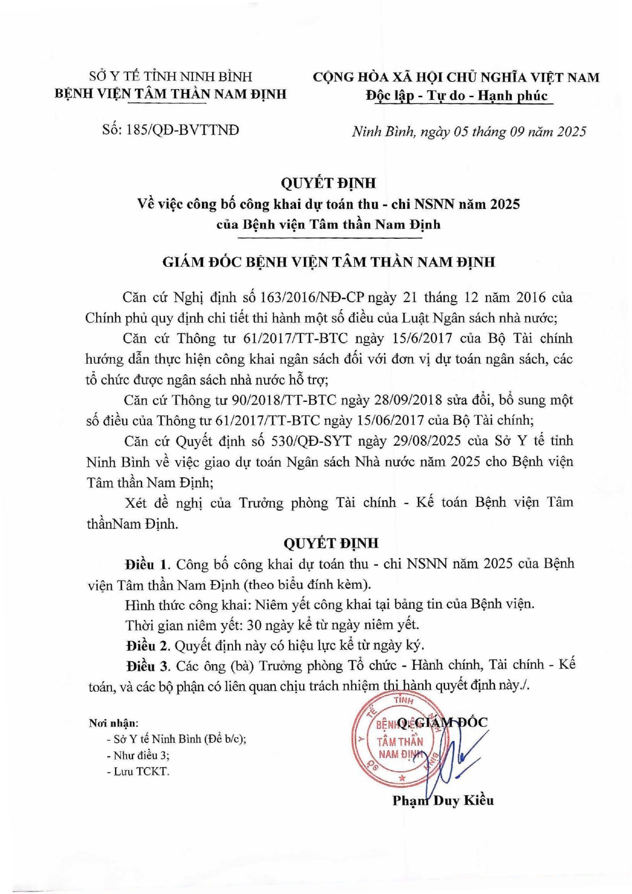 Quyết định về việc công bố công khai dự toán thu chi NSNN năm 2025 của bệnh viện Tâm thần Nam Định
