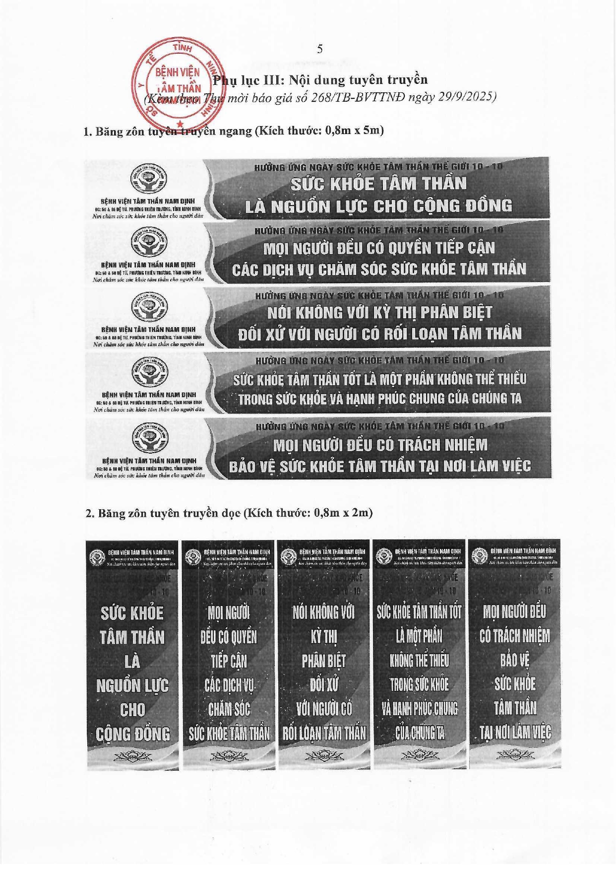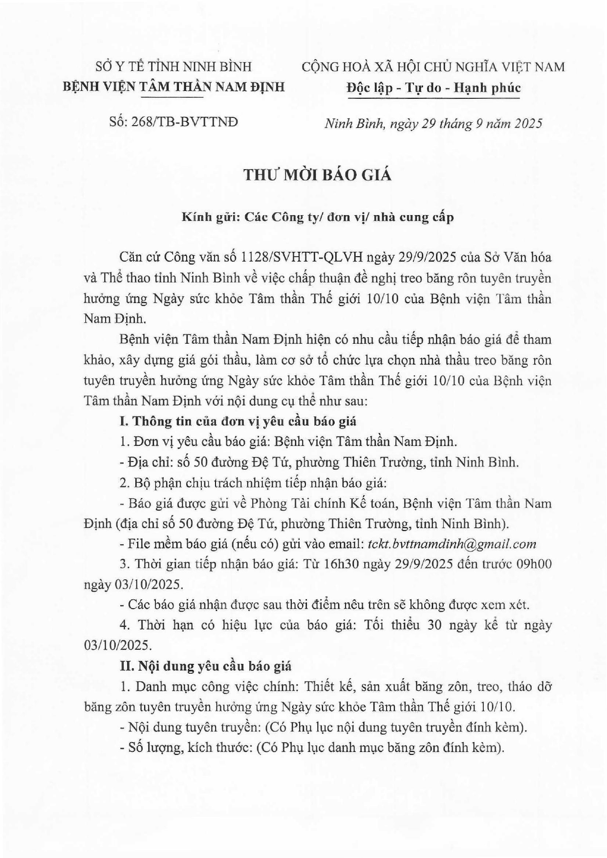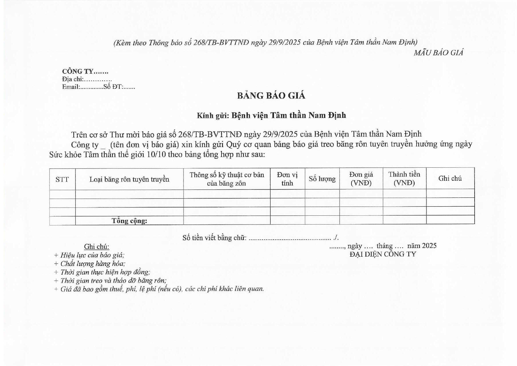 Mẫu báo giá Thư mời báo giá treo băng rôn tuyên truyền hưởng ứng Ngày sức khỏe Tâm thần Thế giới 10-10 của Bệnh viện Tâm thần Nam Định: //docs.google.com/document/d/15uRV_YEjr7geumx9f4gkHujZg6ZomNZ0/edit?usp=sharing&ouid=114463449524900718050&rtpof=true&sd=true