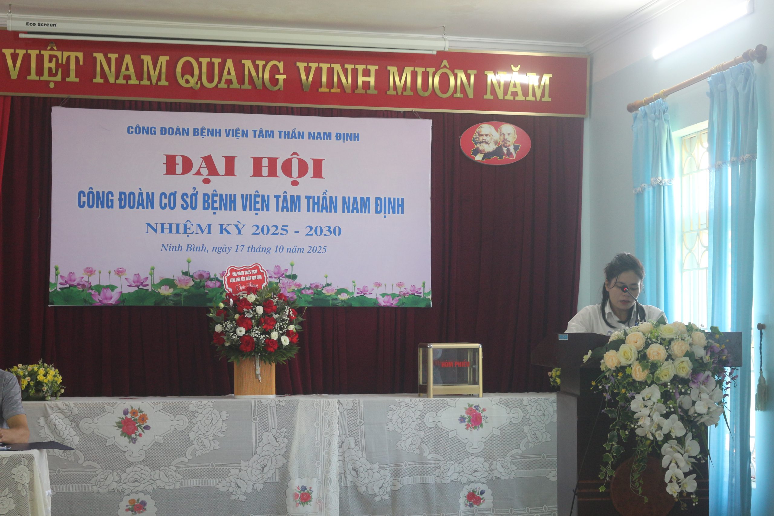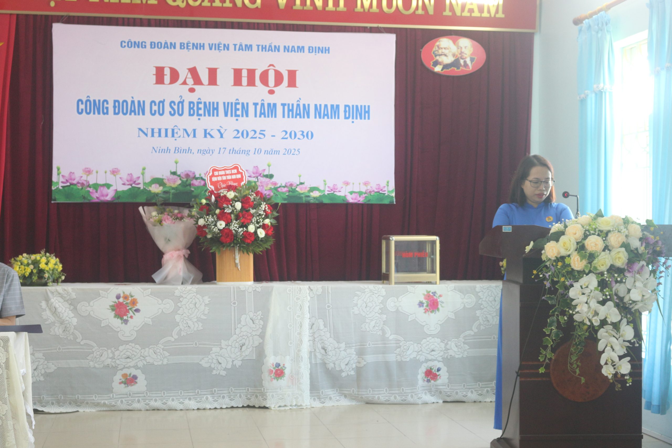 Phát biểu chỉ đạo tại Đại hội, Bà Nguyễn Thị Phương Loan, Phó Chủ tịch Công đoàn phường Thành Nam biểu dương, đánh giá cao những kết quả mà Công đoàn cơ sở Bệnh viện Tâm thần Nam Định đã đạt được trong nhiệm kỳ qua. Đồng thời, nhấn mạnh một số giải pháp để Công đoàn Bệnh viện thực hiện tốt các phương hướng, nhiệm vụ trọng tâm trong nhiệm kỳ 2025 – 2030, xây dựng quy chế làm việc của Ban Chấp hành Công đoàn; Tiếp tục thực hiện tốt công tác tuyên truyền, giáo dục, vận động đoàn viên và người lao động; Thực hiện tốt các phong trào do Công đoàn phát động; Phát hiện và nhân rộng các điển hình tiêu biểu trong hoạt động chuyên môn và hoạt động đoàn thể để bồi dưỡng; Đổi mới và nâng cao hiệu quả các phong trào thi đua… Trong quá trình thực hiện cần phát huy tính dân chủ, tích cực nắm bắt tâm tư, nguyện vọng của công đoàn viên, tranh thủ sự lãnh đạo của cấp ủy, sự hỗ trợ của lãnh đạo đơn vị và Công đoàn cấp trên để thực hiện thắng lợi các nhiệm vụ chính trị của đơn vị.